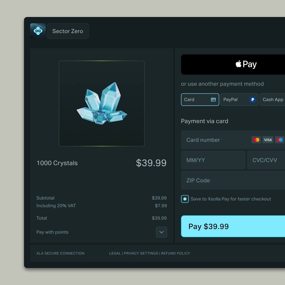 Sell virtual goods and currency directly to players. Global payments, compliance, tax management, and anti-fraud handled for you.