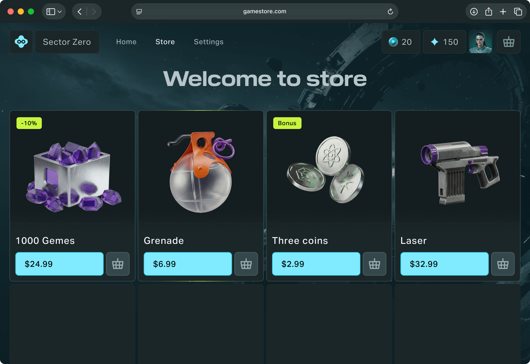 Use the no-code builder to create and manage web stores. Sell in-game items and offer virtual currency.
