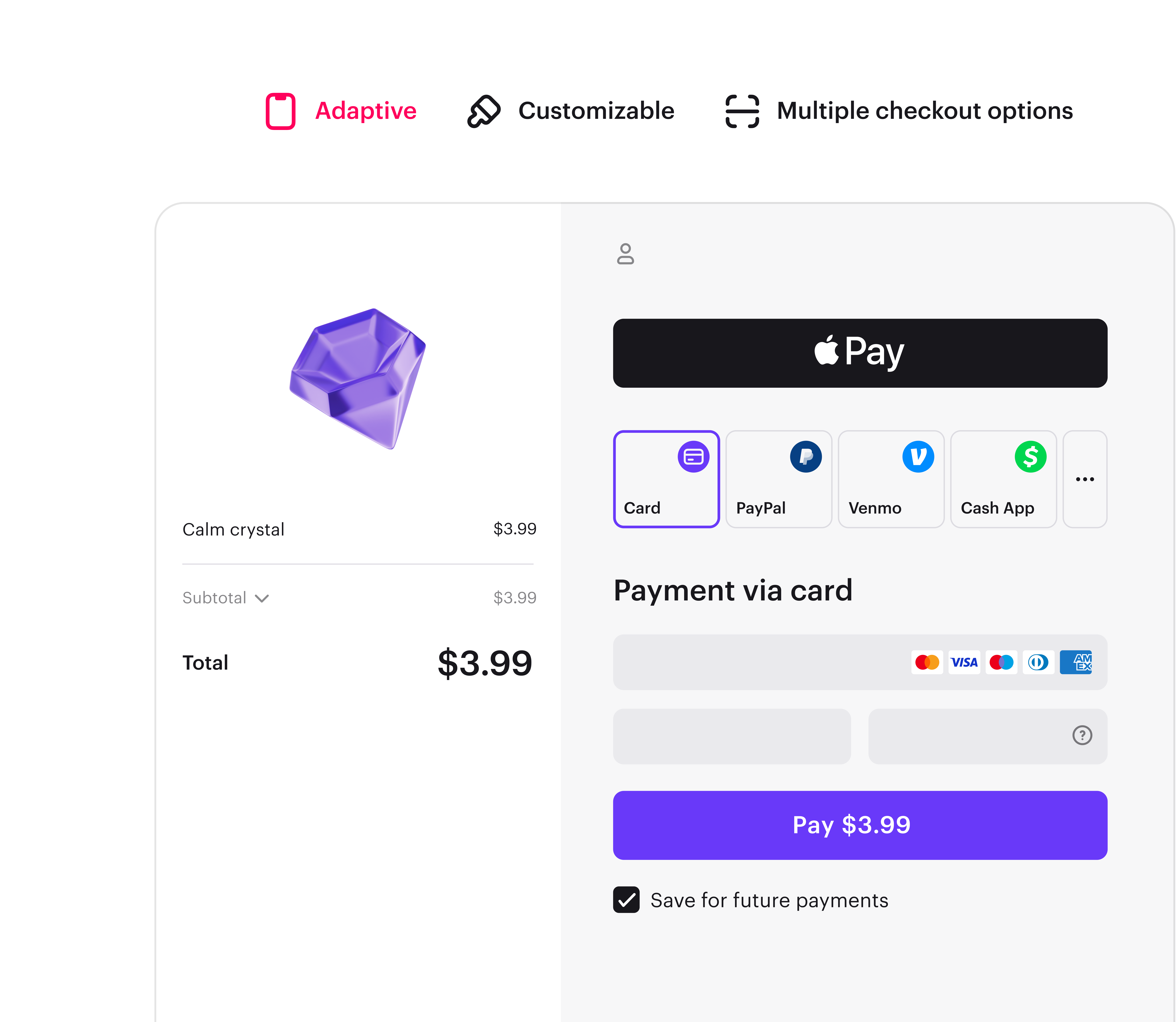 Streamline and secure game payments from anywhere in the world with a customizable and intuitive multi-platform checkout.